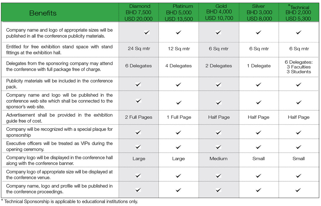 Companies are invited to become official sponsors for the conference and exhibition. The table below describes the different sponsorship levels and their corresponding benefits. Sponsorship will allow companies to promote their products and services to Arab ICT audience and provide the opportunity to interact with other attending professionals.